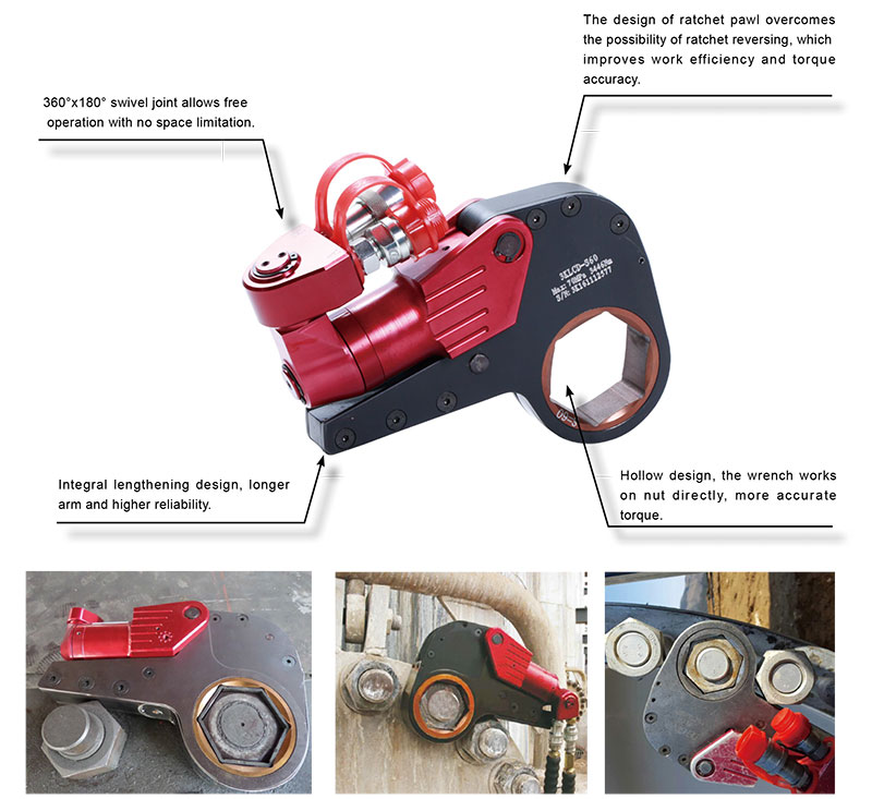 3) KLCD low profile hydraulic torque wrench can run smoothly under a pressure of 70MPa, and have high accuracy, with a torque repeatability of ±3%. The 360×180 degree rotary joint allows it to be operated more freely in any small space.