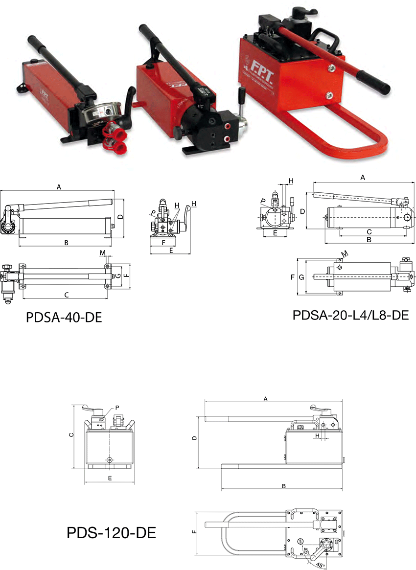 bơm tay thủy lực 2 chiều 700 bar dòng PDSA DE (2 lưu lượng) ở 2 giai đoạn (không tải và có tải) của FPT - Made in Italy có các loại: