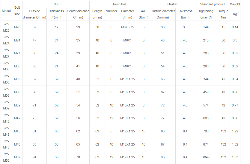 1) Áp suất tối đa của bu lông siêu đai ốc CY dưới tải tiêu chuẩn là 410MPa-890MPa và nó có thể hoạt động bình thường ở nhiệt độ 60 ℃ -200 ℃.