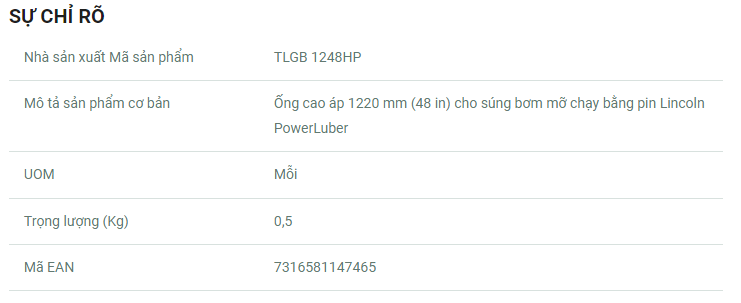 Phụ tùng SKF TLGB 1248HP là ống áp lực cao 1220 mm (48 in) phù hợp với súng bơm mỡ chạy bằng pin dòng SKF TLGB