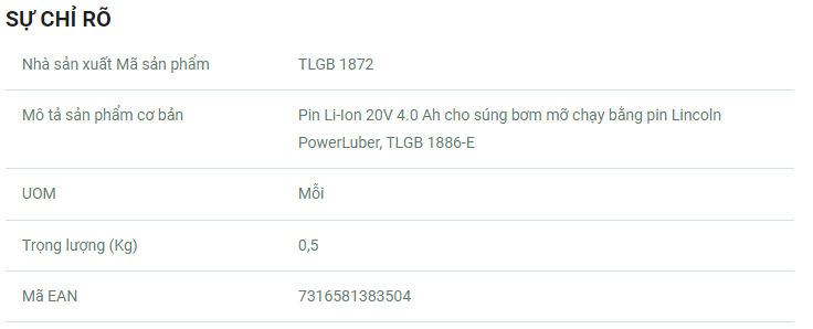 Phụ kiện SKF TLGB 1872 là pin Li-Ion 20V, 4.0 Ah phù hợp với súng bắn mỡ chạy bằng pin SKF TLGB 1886-E.